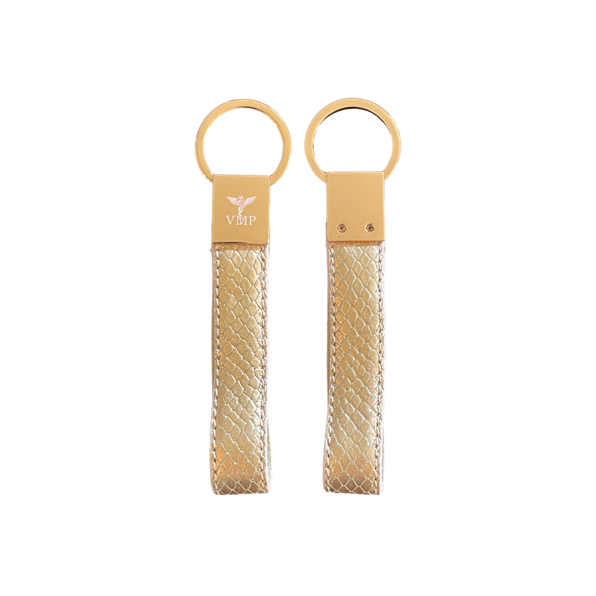 Eleganter VMP Schlüsselanhänger aus goldfarbenem Echtleder mit feiner Schlangenprägung. Luxuriös verarbeitet, handgefertigt in Italien – ein stilvolles Accessoire für Damen und Herren.